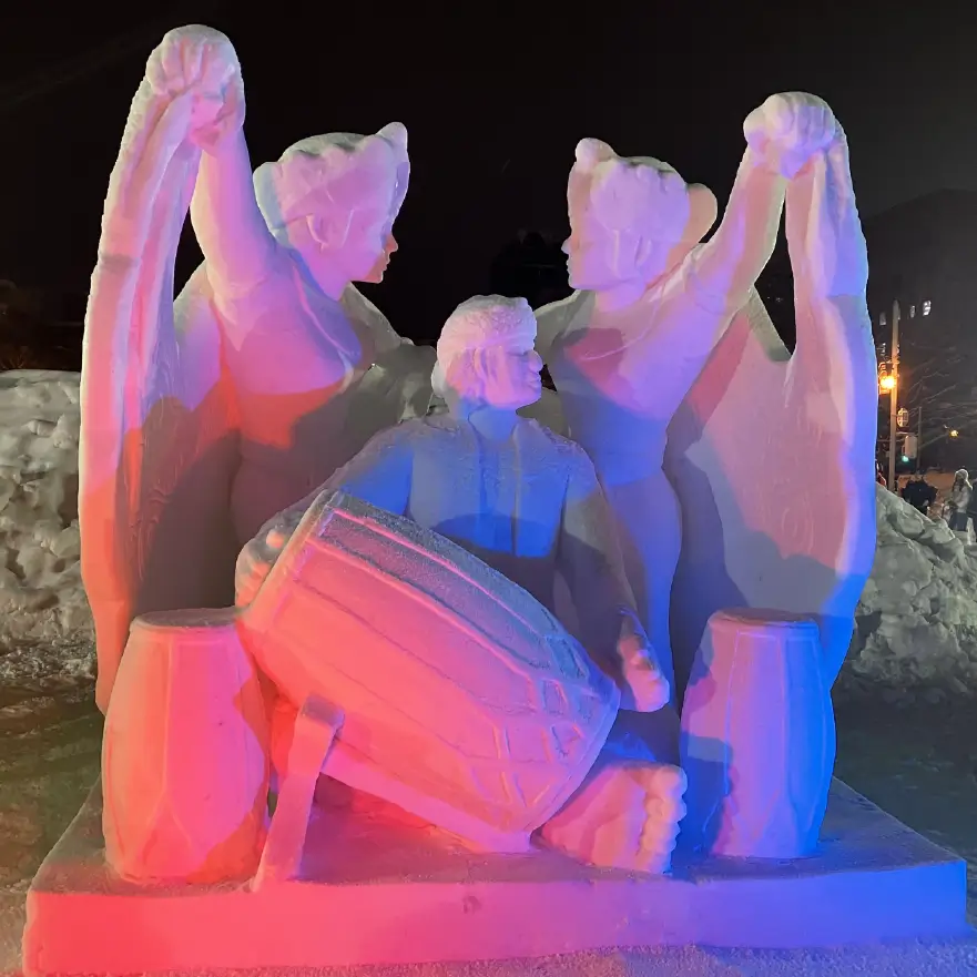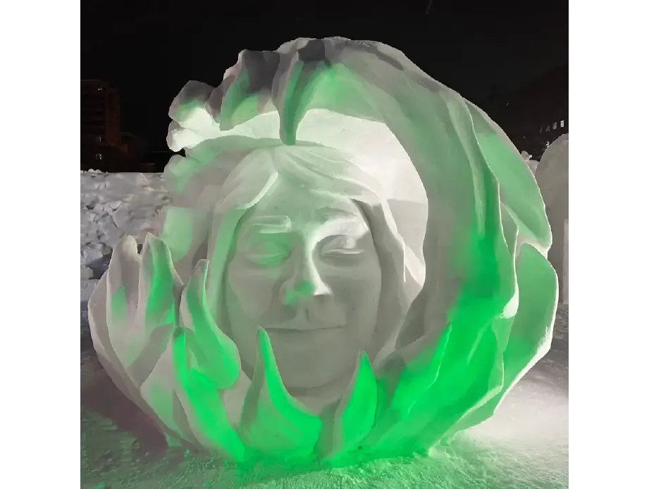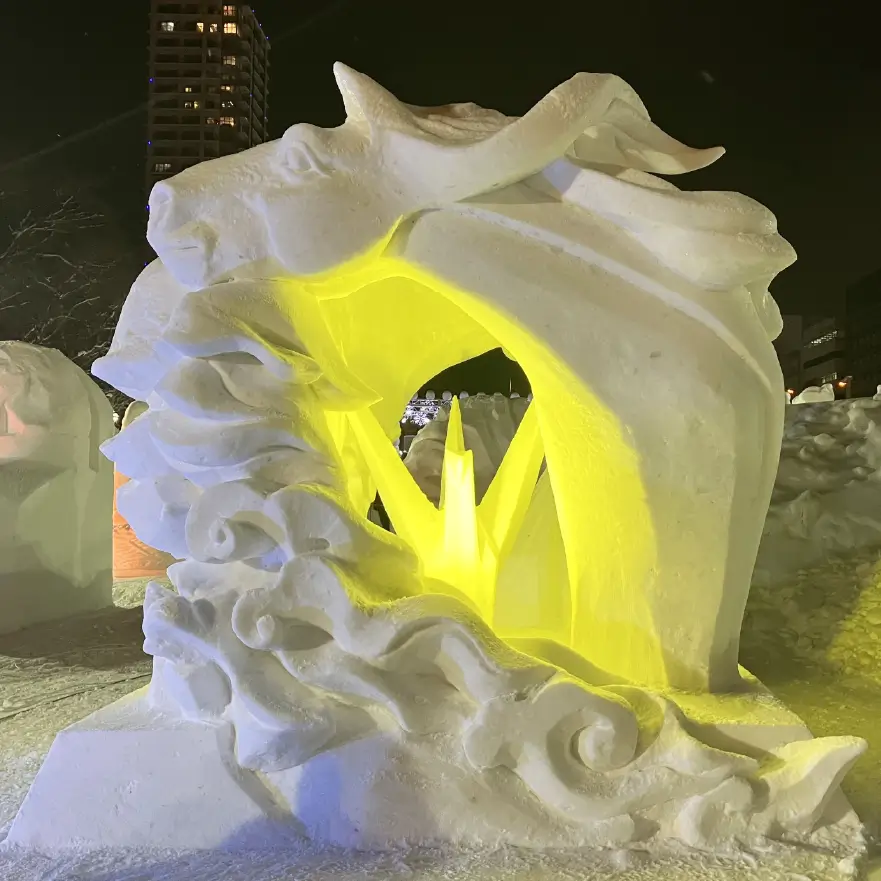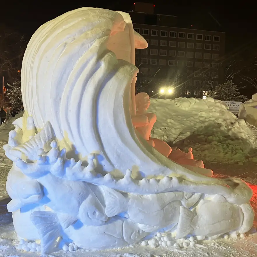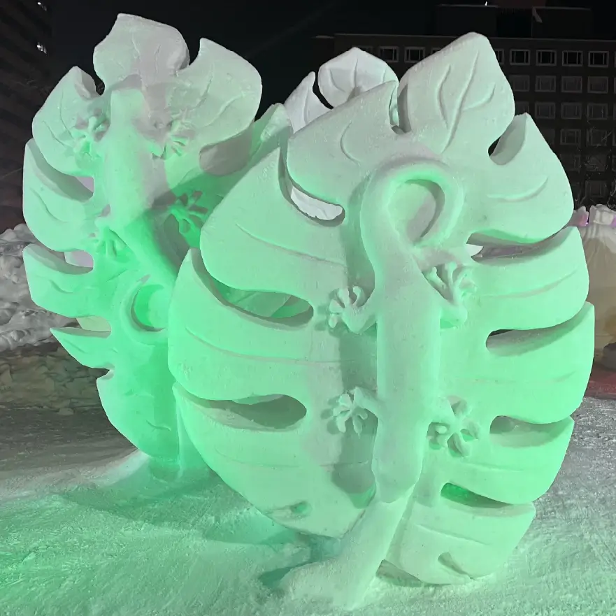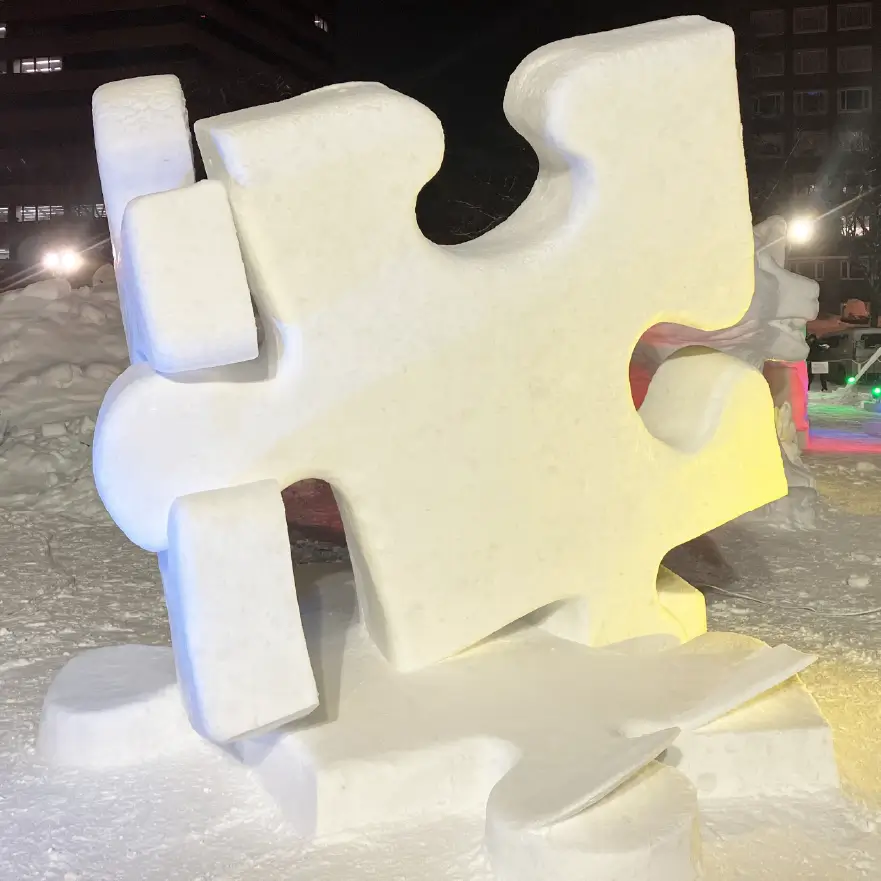 ジグソーパズルの集まりが、不規則な形をしたピースとして広がり、互いにつながり合いながら一つのイメージを形づくろうとしています。この雪像は、人生の道のりが決して「完成」や「完璧」を目指すものではなく、学び、成長し、変化を重ねていく過程であることを、静かに伝えています。創作の旅と同じように、私たちが人生の中で一つ一つ集めていく断片は、それぞれが意味を持ち、これから進む方向や願いを導いてくれます。