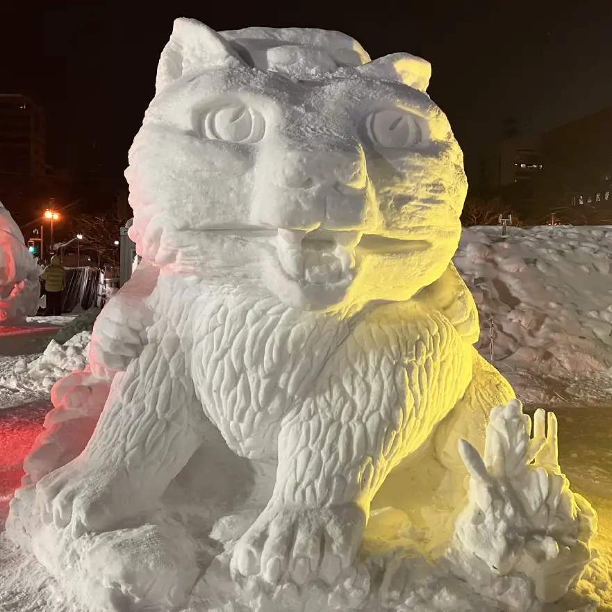 この雪像は、守護と幸運を意味する韓国の民画である「虎作図(ホジャクド)」の象徴性を再現しています。虎は強力な守護神です。この虎の彫刻は民俗芸術における虎特有の奇抜で親しみやすい表情で、楽しい一年になることを願う楽観的な希望を伝えます。