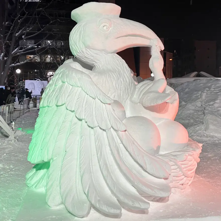幼いキツネが母親に寄り添い、優しい愛情の中でその姿が一つになっています。この雪像は家族の穏やかな調和や、優しい愛と信頼のひとときを表現しており、私たちがどれほど深く互いに結びついているかを気づかせてくれます。