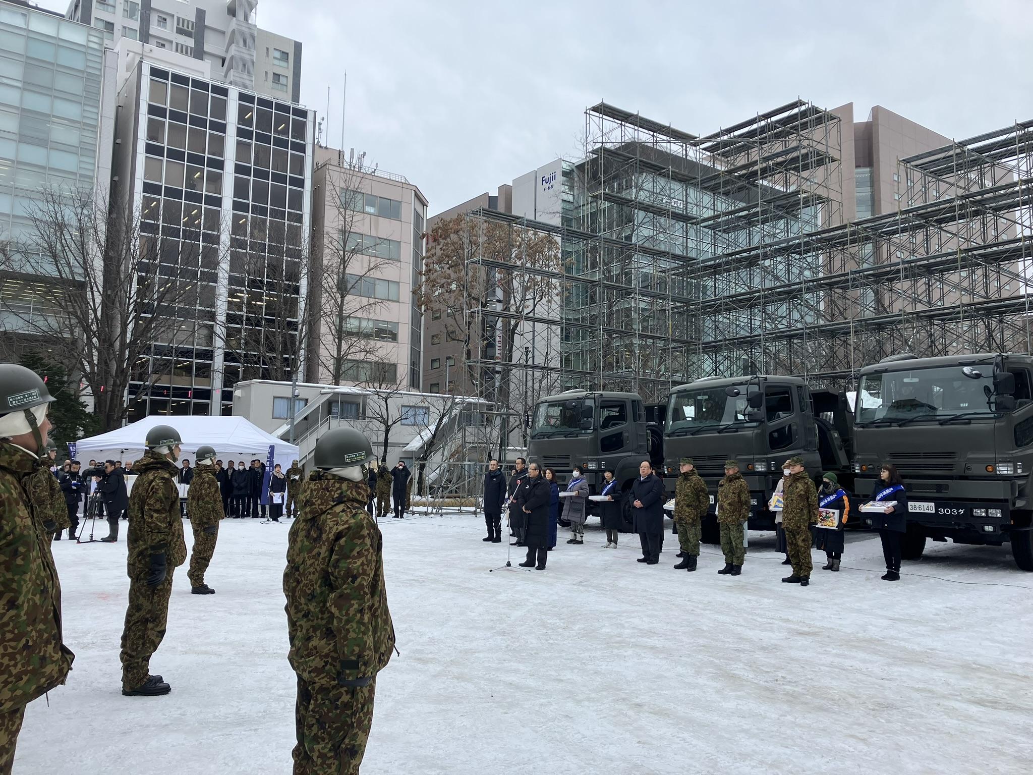 さっぽろ雪まつり実行委員会 笹原 晶博会長のあいさつでは、陸上自衛隊の皆さまへの雪輸送・雪像制作への感謝の言葉が述べられました。