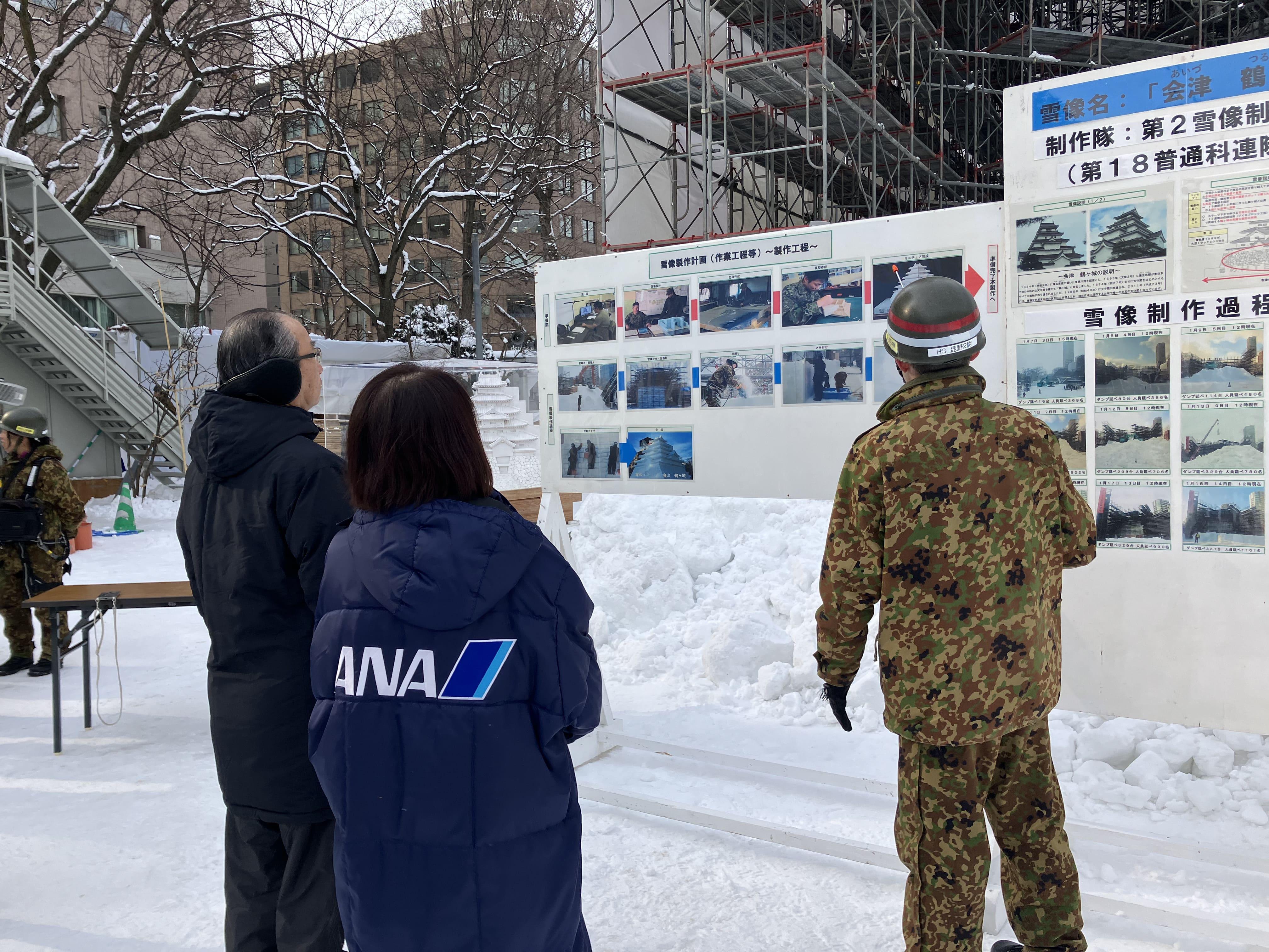 中間点検では、実行委員会会長である札幌観光協会の笹原会長と、雪像委員長である全日本空輸株式会社札幌支店の宮坂支店長が出席し、大通会場4丁目、5丁目、7丁目、8丁目、10丁目の5基の大雪像の制作状況について、各制作隊より説明をいただきました。