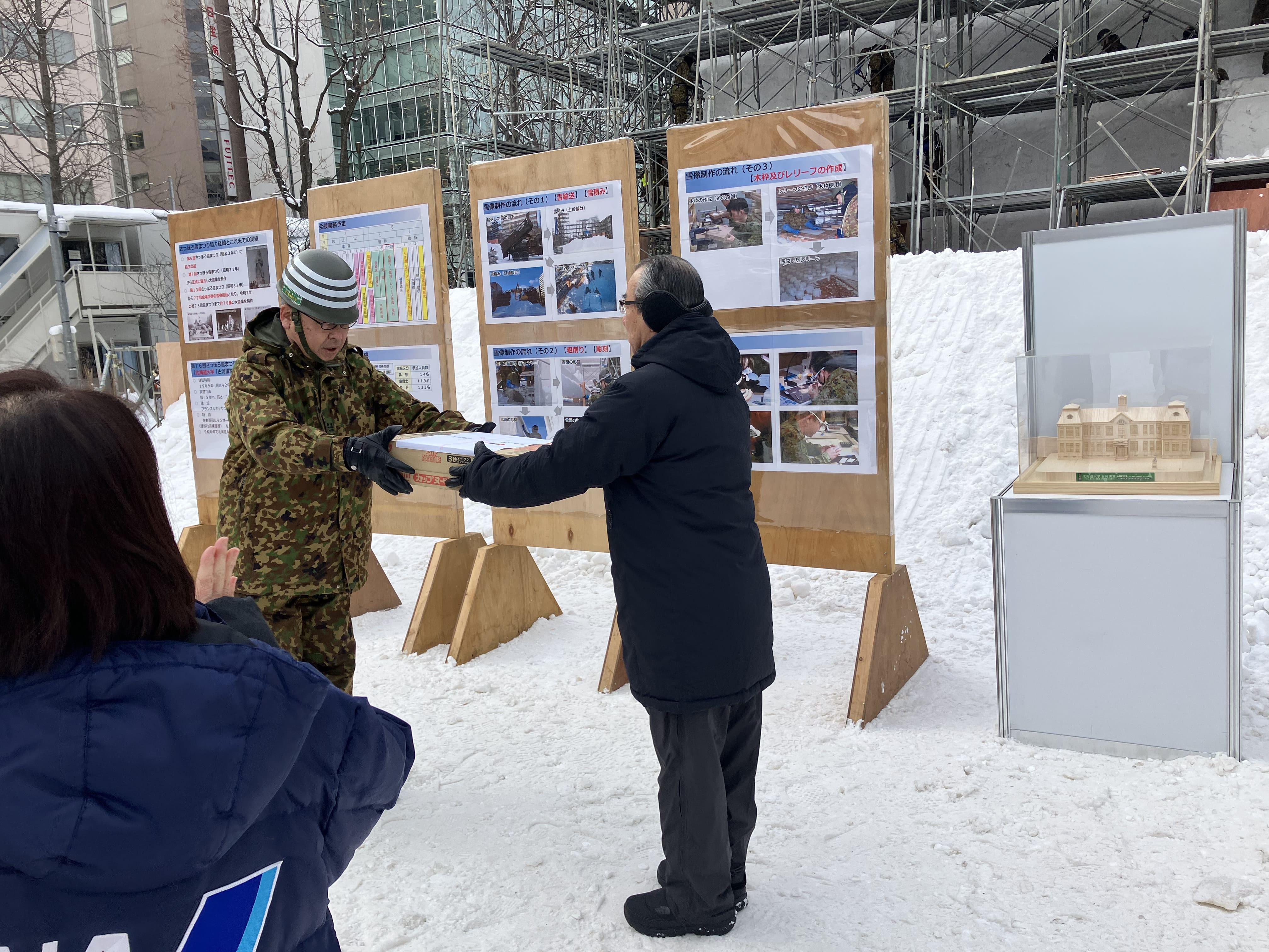 また、陸上自衛隊の雪像制作隊の皆様へ激励の品が贈呈されました。