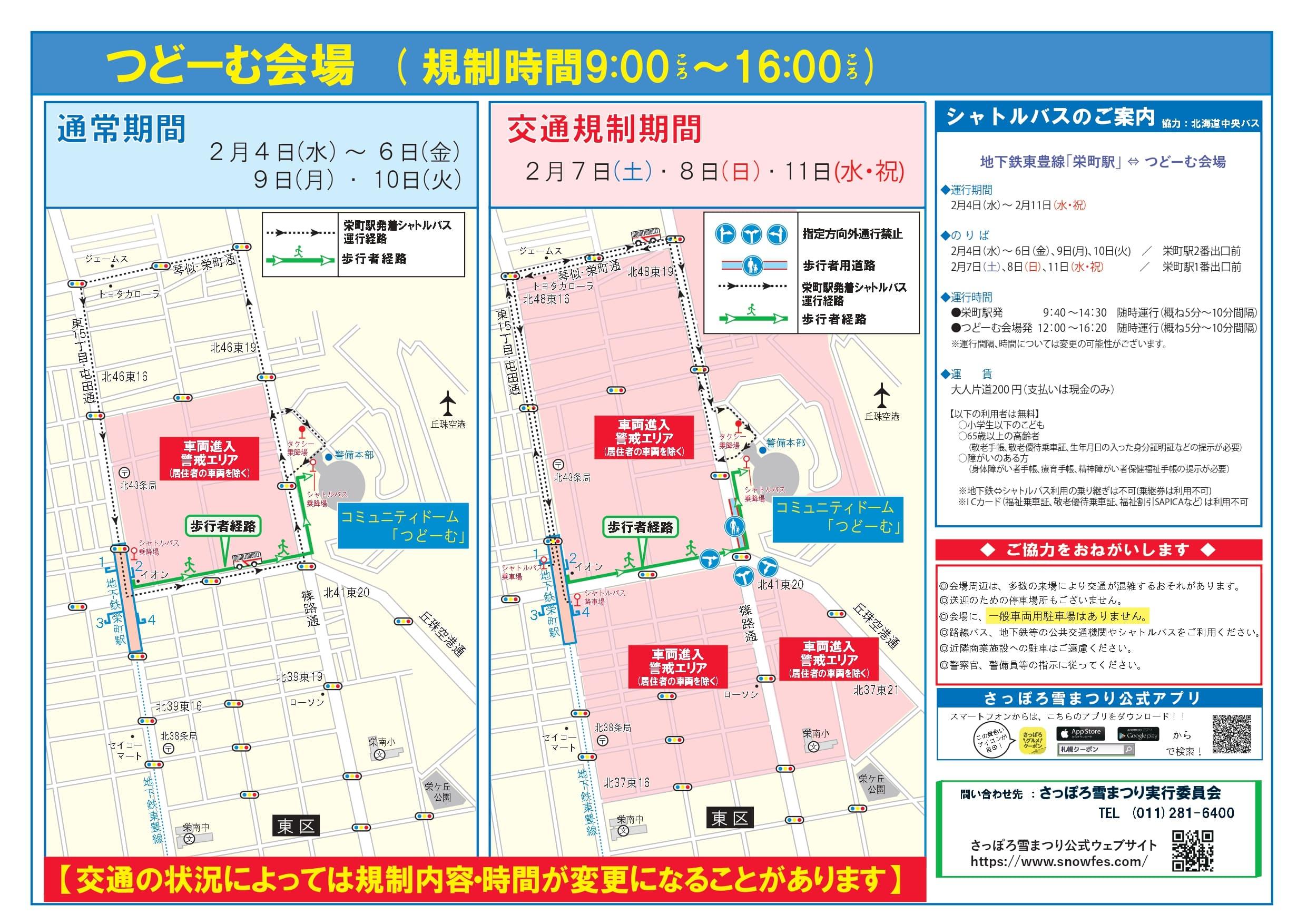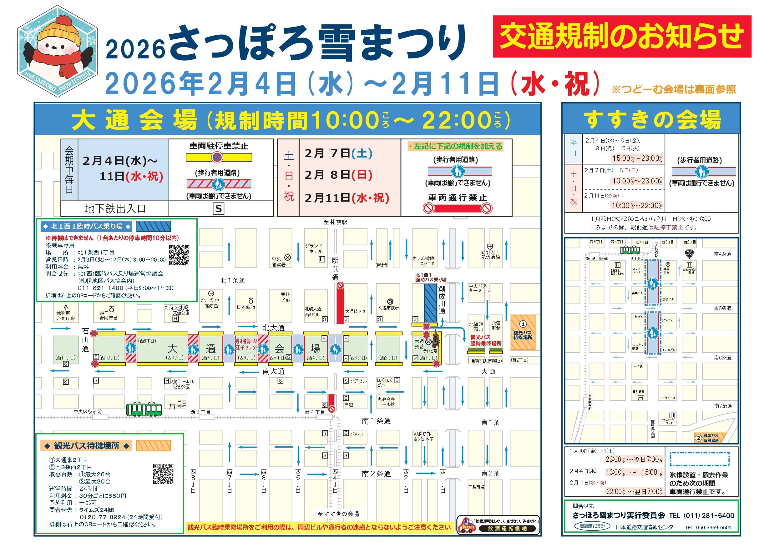 さっぽろ雪まつりの会期中、大通・つどーむ・すすきの会場周辺では一部交通規制が設けられます。